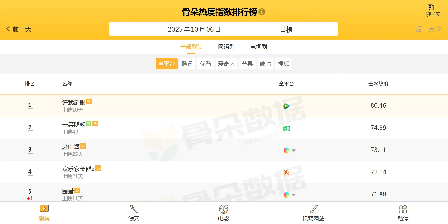 截止发文时间,从“骨朵热度指数排行榜”数据显示可知,当前热播电视剧中,全网热度最高的五部剧分别如下: